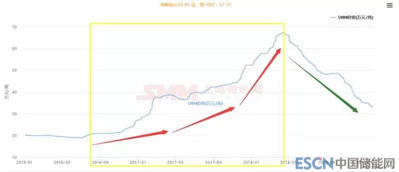 鈷,是生產(chǎn)耐熱合金、硬質(zhì)合金、防腐合金、磁性合金和各種鈷鹽的重要原料,隨著新能源汽車?yán)顺钡牡絹?,作為其?dòng)力電池重要材料的鈷一飛沖天,短短兩年的時(shí)間,便從2016年中旬19萬元/噸飆升至67萬元/噸(2018年4月)。