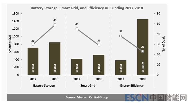 中國儲能網(wǎng)訊:根據(jù)馬克姆資本集團(Mercom Capital Group)的調(diào)查,美國電池儲能、智能電網(wǎng)和能源效率領(lǐng)域的企業(yè)在2018年共獲得28億美元的投資,比2017年增長了87%。