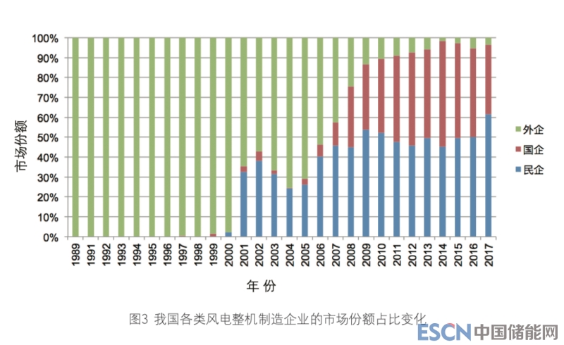 在各類風(fēng)電整機(jī)制造企業(yè)歷年新 增裝機(jī)容量方面,2000年前,外資企 業(yè)幾乎獨(dú)占我國風(fēng)電整機(jī)市場。2001年后,這一局面得以改變。是年,國內(nèi)企業(yè)的市場份額達(dá)到35.4%,外企 下降至64.6%。隨后幾年,前者的占 比有所下滑,且?guī)缀跞縼碜悦衿蟆?004年,國內(nèi)企業(yè)的市場占有率降至24.7%。此后,隨著國內(nèi)整機(jī)制造企 業(yè)數(shù)量的增多,這類企業(yè)所占市場份 額迅速提高,2014年達(dá)到歷史高點(diǎn)的98.3%,近幾年一直保持在95%以上。 而外企的份額自2011年以來已經(jīng)被壓 縮到不足10%。