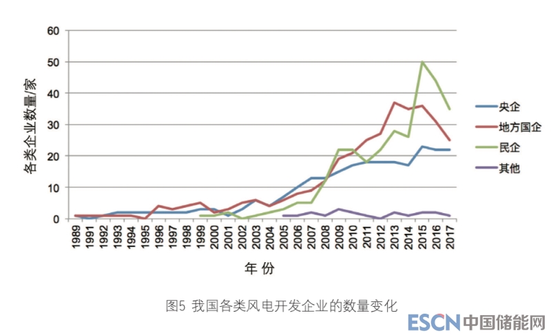 與整機(jī)制造企業(yè)數(shù)量變化走勢稍 顯不同的是,我國風(fēng)電開發(fā)企業(yè)數(shù)量 整體上一直呈增長之勢。2003年前, 這些企業(yè)的數(shù)量不足10家。自此逐步增加,2010年首次突破60家,2015年更是超過了110家,此后有所減少。 在這些企業(yè)中,多為國內(nèi)企業(yè),外資企業(yè)鮮有參與。國內(nèi)企業(yè)又可以 進(jìn)一步細(xì)分為由央企和地方國企組成 的國企、民企。2008年前,央企和地 方國企一直是我國風(fēng)電開發(fā)的主體, 民企數(shù)量較少。2008年以來,民企迅 速增多,2009年、2010年首次超過 央企和地方國企。2015年,在我國風(fēng) 電開發(fā)企業(yè)整體數(shù)量迅猛增長的情況 下,民企異軍突起,達(dá)到50家,在 數(shù)量上再次大幅超越央企和地方國企,2016-2017年一直保持這種態(tài)勢。