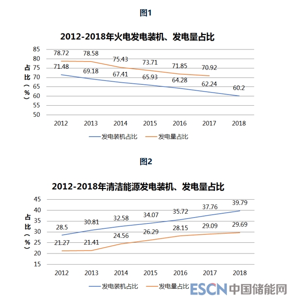 2012年以來,核電、風(fēng)電、太陽能設(shè)備容量年均增速分別達到23.5%、20.1%和92.7%,清潔能源發(fā)電裝機占比從2012年的28.50%上升到2018年的39.79%,火電裝機占比則從71.48%下降至60.20%。與此同時,清潔能源發(fā)電量比重也逐年提高,從2012年的21.27%上升至2018年的29.69%,火電發(fā)電量占比則從78.72%下降至70.92%。