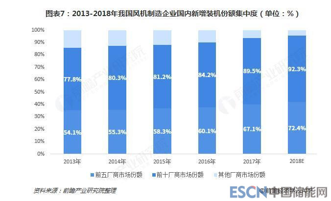 近5年,風(fēng)電整機(jī)制造企業(yè)的市場(chǎng)份額集中趨勢(shì)越發(fā)明顯。排名前五的風(fēng)電機(jī)組制造企業(yè)新增裝機(jī)市場(chǎng)份額由2013年的54.1%增長(zhǎng)到2017年的67.1%,增長(zhǎng)了13%;排名前十的風(fēng)電制造企業(yè)新增裝機(jī)市場(chǎng)份額由2013年的77.8%增長(zhǎng)到2017年的77.8%增長(zhǎng)到2017年的89.5%,增長(zhǎng)了12%。