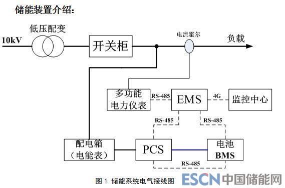 儲(chǔ)能系統(tǒng)容量為100kW/494kWh,由磷酸鐵鋰電池、電池管理系統(tǒng)(BMS)、儲(chǔ)能變流器(PCS)、儲(chǔ)能監(jiān)控柜(EMS)、測(cè)控裝置等組成,采用T接方式接入380V配電網(wǎng)。