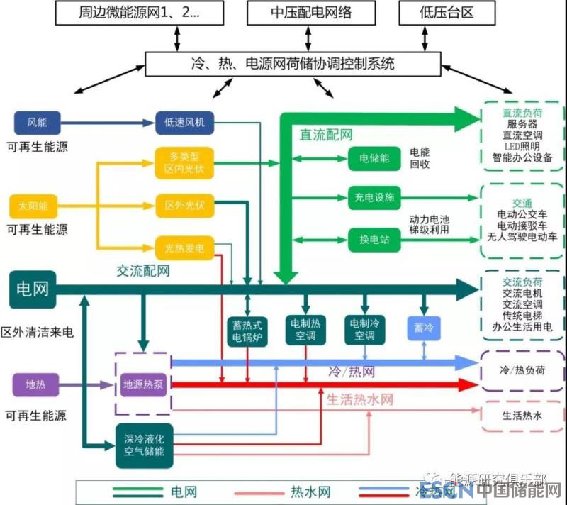目前,同里綜合能源服務(wù)中心除中心主樓未建成外,其他能源創(chuàng)新類(lèi)項(xiàng)目于2018年10月18日前均已建成投運(yùn),全部建成后園區(qū)的清潔能源占比將達(dá)到70%。一期工程涵蓋15項(xiàng)世界領(lǐng)先的能源創(chuàng)新示范工程,見(jiàn)圖1,具體包括:①多能綜合互補(bǔ)利用項(xiàng)目:光伏裝機(jī)477千瓦,4個(gè)5千瓦的低風(fēng)速垂直軸風(fēng)機(jī),2200千瓦地源熱泵冰蓄冷系統(tǒng);②微網(wǎng)路由器,為國(guó)家重點(diǎn)研發(fā)計(jì)劃項(xiàng)目;③壓縮空氣儲(chǔ)能系統(tǒng);④預(yù)制艙式儲(chǔ)能系統(tǒng);⑤高溫相變儲(chǔ)熱系統(tǒng);⑥高溫相變光熱發(fā)電;⑦源網(wǎng)荷儲(chǔ)協(xié)調(diào)控制系統(tǒng);⑧低壓直流配電環(huán)網(wǎng);⑨中低壓交直流配套系統(tǒng);⑩同里綜合能源服務(wù)平臺(tái);“三合一”電子公路;負(fù)荷側(cè)虛擬同步機(jī);綠色充換電站;同里綜合能源服務(wù)平臺(tái);綜合能源展示中心。