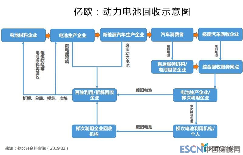 動力電池的回收并非靠一己之力,而是靠全產(chǎn)業(yè)鏈權(quán)責(zé)分明的通力合作。電池生產(chǎn)商將電池的型號、回收標(biāo)準(zhǔn)注明清楚交由汽車生產(chǎn)商組造電池驅(qū)動系統(tǒng),此時的主機廠對電池回收需要承擔(dān)著教育用戶的職責(zé),將動力電池的使用標(biāo)準(zhǔn)告知消費者,并培養(yǎng)其循環(huán)和回收使用的認(rèn)知,再由第三方或是主機廠渠道商服務(wù)動力電池回收,將回收的電池進行再利用或是梯次使用。而梯次利用企業(yè)應(yīng)回收梯次利用電池產(chǎn)品生產(chǎn)、檢測、使用等過程中產(chǎn)生的廢舊動力蓄電池,集中貯存并移交至再生利用企業(yè)。