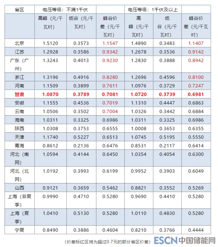 部分超過0.7元/千瓦時的省區(qū)價差利于促進儲能的發(fā)展