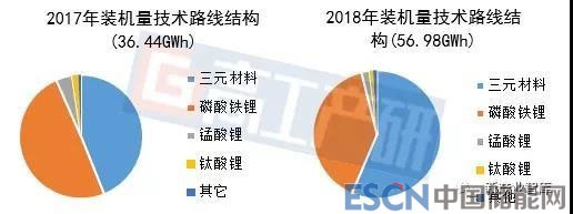 2018年三元材料在正極材料細(xì)分領(lǐng)域中出貨量同比增長(zhǎng)最快,主要原因有:1)2017~2018年下游三元電池新增產(chǎn)能釋放,三元材料采購(gòu)量加大;2)新版補(bǔ)貼額度與能量密度掛鉤,使動(dòng)力電池向三元電池路線發(fā)展的趨勢(shì)更明顯。2018年三元電池裝機(jī)量比例為56.44%,較2017年提升了12.5個(gè)百分點(diǎn)。