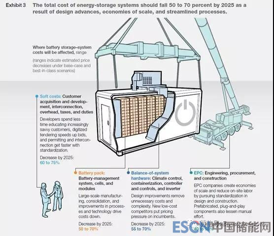 圖3 由于設(shè)計(jì)進(jìn)步、規(guī)模經(jīng)濟(jì)和流程簡(jiǎn)化,到2025年,儲(chǔ)能系統(tǒng)的總成本將下降50%至70%。