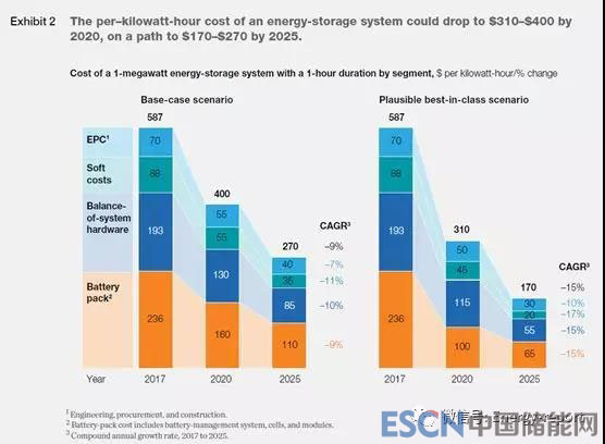 圖2 到2020年,儲(chǔ)能系統(tǒng)的單位千瓦時(shí)成本可能會(huì)降至310至400美元,到2025年將達(dá)到170至270美元。