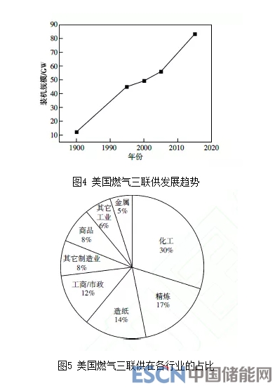 燃?xì)饫錈犭娙?lián)供在國(guó)外已有30多年發(fā)展歷史,在美國(guó)、日本等國(guó)家得到大力發(fā)展和推廣。當(dāng)前,幾乎所有的歐盟國(guó)家正在建立適合自身特點(diǎn)的天然氣分布式能源系統(tǒng)以及與之相配套的能源計(jì)劃。美國(guó)的燃?xì)饫錈犭娙?lián)供裝機(jī)規(guī)模發(fā)展趨勢(shì)如圖4所示,其在各行業(yè)中的占比情況如圖5所示: