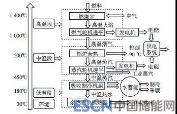 燃?xì)饫錈犭娙?lián)供是指以天然氣為主—燃料帶動(dòng)燃?xì)廨啓C(jī)或內(nèi)燃機(jī)等燃?xì)獍l(fā)電設(shè)備運(yùn)行,產(chǎn)生電力以滿足用戶電力需求,而系統(tǒng)排出的廢熱則通過(guò)余熱鍋爐或溴化鋰等設(shè)備向用戶供熱、供冷。三聯(lián)供系統(tǒng)實(shí)現(xiàn)能源的梯級(jí)利用,其能源綜合利用效率高達(dá)80%以上,典型能量梯級(jí)利用如圖1所示: