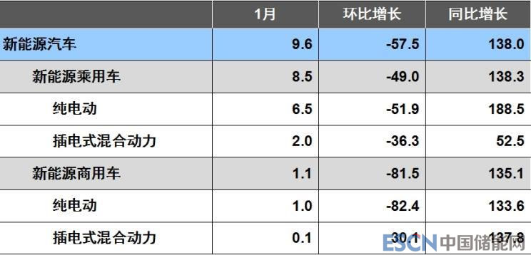 從新能源汽車(chē)產(chǎn)銷(xiāo)情況來(lái)看,1月份,新能源汽車(chē)產(chǎn)銷(xiāo)分別完成9.07萬(wàn)輛和9.57萬(wàn)輛,比上年同期分別增長(zhǎng)1.1倍和1.4倍。其中純電動(dòng)汽車(chē)產(chǎn)銷(xiāo)分別完成6.70萬(wàn)輛和7.49萬(wàn)輛,比上年同期分別增長(zhǎng)1.4倍和1.8倍;插電式混合動(dòng)力汽車(chē)產(chǎn)銷(xiāo)分別完成2.37萬(wàn)輛和2.08萬(wàn)輛,比上年同期分別增長(zhǎng)59.92%和54.55%。