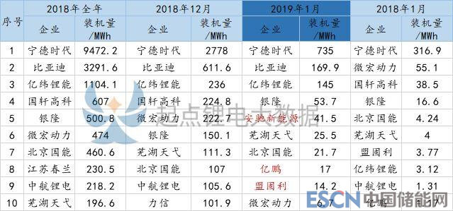 排名前十的動力電池企業(yè)分別是寧德時代、比亞迪、億緯鋰能、銀隆、安馳新能源、蕪湖天弋、北京國能、億鵬、盟固利和微宏動力。