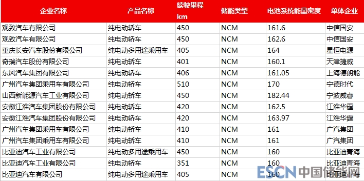 本次目錄中,共有14款新能源乘用車能量密度在160Wh/Kg及以上,電池種類均為三元電池,比亞迪、江淮華霆、廣汽集團(tuán)、中信國(guó)安等提供以上配套電池。其中,由山西新能源申報(bào)的一款帝豪牌純電動(dòng)轎車的電池系統(tǒng)能量密度高達(dá)182.44wh/kg,配套電池企業(yè)為寧波威睿,創(chuàng)造了當(dāng)前國(guó)產(chǎn)動(dòng)力電池能量密度的新高。