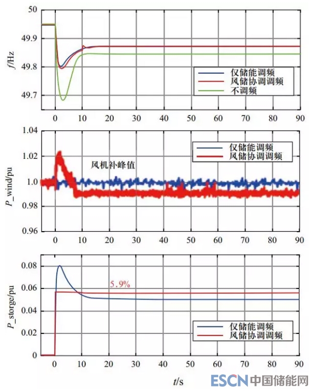 基于本文所提風(fēng)儲(chǔ)協(xié)同調(diào)頻控制策略,模擬風(fēng)電裝機(jī)容量占比為20%的電力系統(tǒng)中發(fā)生5%功率缺額事件后,在6.2 m/s,8.6 m/s和11.2 m/s 3種風(fēng)速條件下時(shí)儲(chǔ)能系統(tǒng)的調(diào)頻容量需求,仿真得到風(fēng)速11.2 m/s時(shí)儲(chǔ)能容量需求最多,為風(fēng)電場裝機(jī)容量的5.9%,相比儲(chǔ)能單獨(dú)承擔(dān)調(diào)頻任務(wù)時(shí)8% pu時(shí)減少了26%。