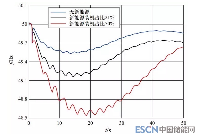 為分析新能源裝機(jī)占比提升后電力系統(tǒng)的頻率特性,針對(duì)華北電網(wǎng)新能源裝機(jī)占比為0%、21%和50%這3種系統(tǒng)進(jìn)行仿真研究,得到了系統(tǒng)發(fā)生5%功率缺額后電網(wǎng)頻率動(dòng)態(tài)特性曲線圖。說明如果新能源機(jī)組不具備一次調(diào)頻能力,隨著新能源裝機(jī)占比的提升,電網(wǎng)對(duì)功率突變事件的抗干擾能力將大為削弱。