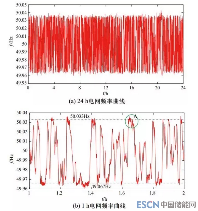 對(duì)華北電網(wǎng)某35kV母線PMU頻率數(shù)據(jù)進(jìn)行長期統(tǒng)計(jì),隨機(jī)抽取一天頻率如圖(a)所示,看出該地區(qū)電網(wǎng)正常運(yùn)行工況下頻率波動(dòng)范圍在 50±0.04Hz以內(nèi),頻率日越過火電機(jī)組調(diào)頻死區(qū)±0.033 Hz的總次數(shù)為1670次,其中越上限720次,越下限950次;圖(b)為其中1小時(shí)的頻率曲線,觀察圖中A區(qū)域,當(dāng)電網(wǎng)頻率越過一次調(diào)頻死區(qū)上限,地區(qū)火電機(jī)組一次調(diào)頻功能啟動(dòng),頻率被調(diào)整回正常范圍。