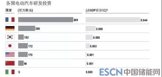 在技術(shù)層面,排名最后的兩位是中國(guó)和意大利。從研發(fā)支持角度來(lái)看差距尤為突出,中國(guó)電動(dòng)汽車研發(fā)投資僅為9800萬(wàn)歐元,對(duì)比研發(fā)投資金額最高的法國(guó),簡(jiǎn)直云泥之別。