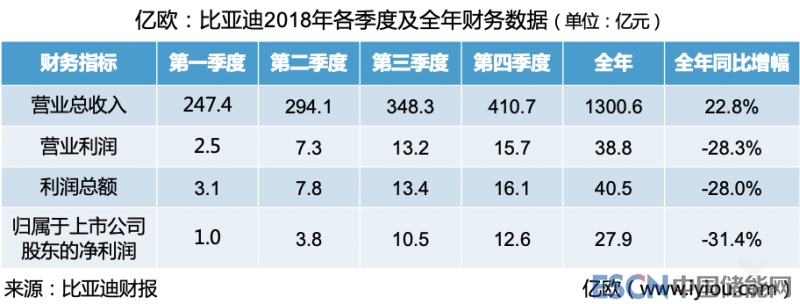2月26日晚間,比亞迪發(fā)布2018年度財(cái)報(bào)。財(cái)報(bào)信息顯示,公司營(yíng)業(yè)總收入達(dá)1300.55億元,同比增長(zhǎng)22.79%;歸屬于上市公司股東凈利潤(rùn)達(dá)27.91億元,同比下滑31.4%。盈利表現(xiàn)基本符合此前比亞迪在第三季度報(bào)告中提到的2018年凈利潤(rùn)同比下滑23.10%~32.94%的預(yù)測(cè)。
