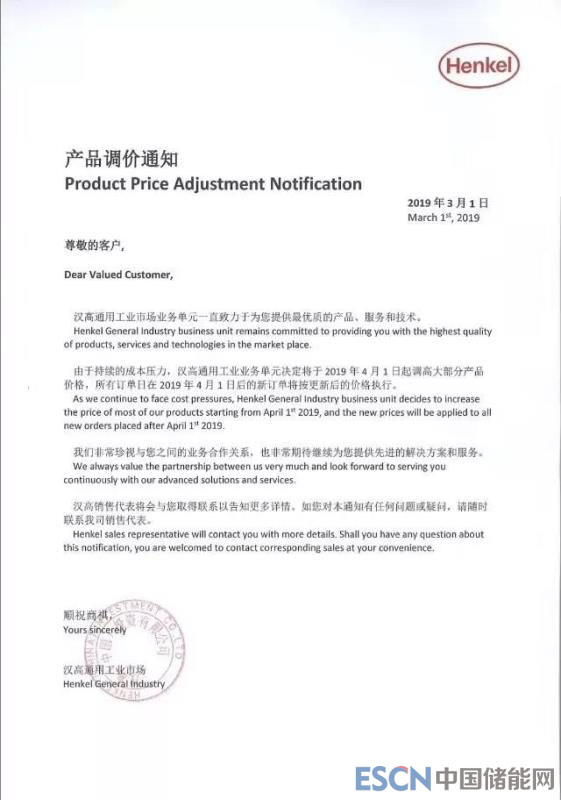 近日,膠黏劑企業(yè)“漢高通用”給用戶發(fā)出了調(diào)價函,自4月1日起的訂單將全面條件。
