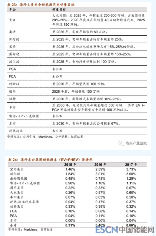 在2018-2025年期間,將推出的新能源車型總數(shù)將大于303款,年均38款以上;而2015-2017年海外13大車企集團(tuán)年均上市車型為13款。新車型推出數(shù)量快速增長,而其中部分企業(yè)還未提出明確的車型數(shù)量目標(biāo)。