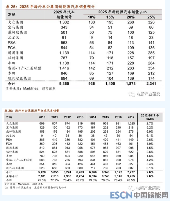 2025年海外車企新能源車當(dāng)年銷量預(yù)計(jì)達(dá)1400萬輛以上。2012-2017年,海外12大車企集團(tuán)(不包含特斯拉)所有整車銷量CAGR約2.6%。假設(shè)該復(fù)合增速為2017-2025年的增速,對(duì)應(yīng)2025年銷量為9365萬輛。我們分別假設(shè)2025年12大車企集團(tuán)新能源汽車(EV+PHEV)滲透率為10%、15%、20%、25%,分別對(duì)應(yīng)936、1405、1873、2341萬輛的當(dāng)年銷量。中性預(yù)測(cè)2025年海外12大車企的新能源汽車銷量有望達(dá)到1400-1900萬輛。