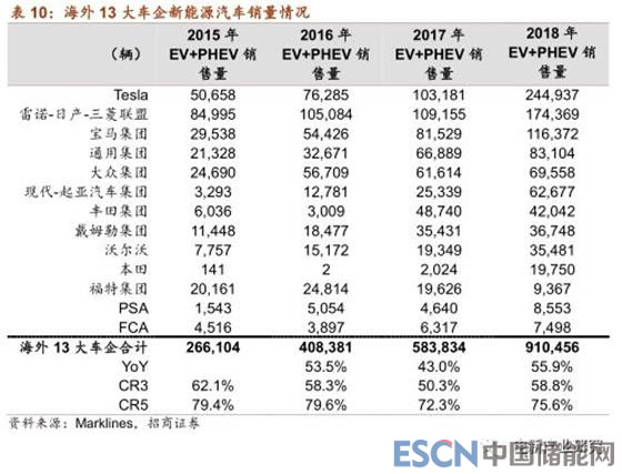 2018年特斯拉、雷諾-日產(chǎn)-三菱聯(lián)盟和寶馬兩家占據(jù)電動(dòng)車(EV+PHEV)銷量的前兩位,達(dá)到10萬臺(tái)水平,通用、大眾、現(xiàn)代起亞分列3-6位,銷量在6萬臺(tái)以上(通用在8萬臺(tái)以上)。2015-2018年行業(yè)格局較為穩(wěn)固,銷量前5名基本沒有變化。