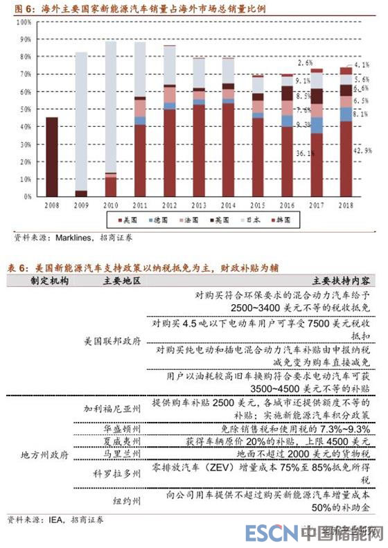 美國是海外新能源汽車銷量最大的單一國家。2018年,美國新能源汽車銷售35.1萬輛,增長79.6%,占海外新能源汽車市場(chǎng)比例達(dá)到42.9%,較2017年提升6.8個(gè)百分點(diǎn),連續(xù)多年為海外新能源汽車銷量最大的單一國家。美國從80年代開始著手新能源汽車的研發(fā),近幾屆政府重視程度也比較高,構(gòu)建了以納稅減免為主、購車補(bǔ)貼為輔的產(chǎn)業(yè)支持政策;美國國內(nèi)也出現(xiàn)了特斯拉為代表的創(chuàng)新企業(yè)。