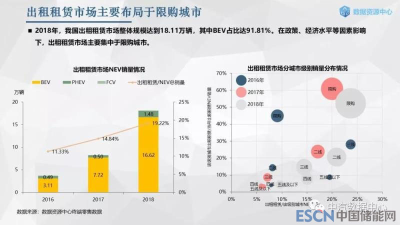 出租租賃市場2018年整體規(guī)模達到18.11萬輛,同比增長120%。區(qū)別于個人新能源市場,出租租賃市場主要以BEV為主,占比高達92%,其中A00級轎車多應用于分時租賃,A級轎車、MPV多用于出租車和網(wǎng)約車。受政策、經(jīng)濟水平、使用場景等因素影響,出租租賃市場主要集中于一線限購城市。