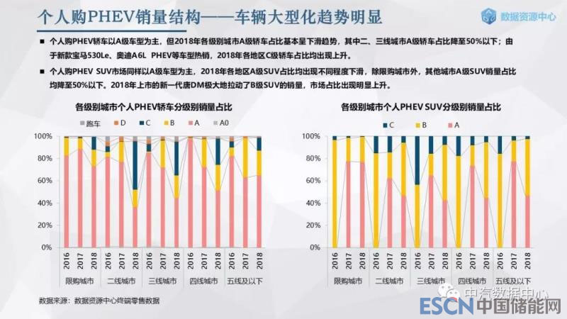 個人消費市場PHEV銷量占比30%,高于整體市場占比,個人消費者對于PHEV的購買意愿相對更強。A級轎車和A級SUV是個人PHEV市場的主力車型,隨著新款寶馬530Le、新一代唐DM、WEY P8等產(chǎn)品上市,這一系列車型或?qū)⑼苿觽€人PHEV產(chǎn)品結(jié)構(gòu)向大型化轉(zhuǎn)移,并且這一現(xiàn)象在二線及以下城市更為明顯。