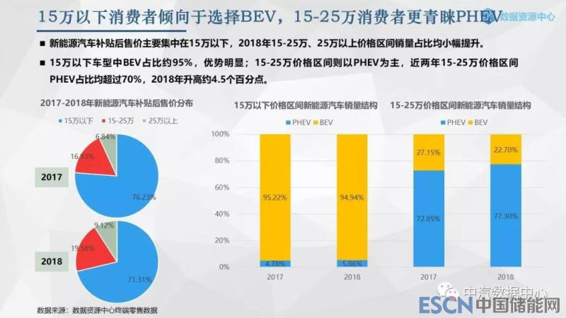 受經(jīng)濟收入水平、傳統(tǒng)車牌照價格等因素影響,一線限購城市15萬以上新能源車型銷量占比接近45%,其中15-25萬車型份額超過30%,大幅領先其他城市。非限購城市中15萬以下車型為銷售主力,但15萬以上車型占比較上一年有所提升。據(jù)統(tǒng)計,在15-25萬元的售價區(qū)間,70%以上的消費者更傾向于PHEV;而在15萬元以下售價區(qū)間,由于PHEV的可選擇性很小,90%以上的消費者選擇了BEV,這也是一線限購城市能夠驅(qū)動PHEV快速發(fā)展的主要原因。