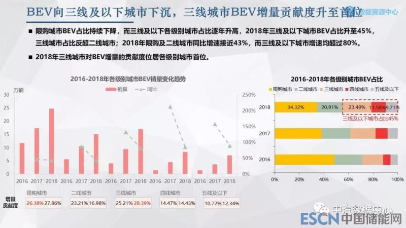 BEV在新能源技術進步、消費者觀念改變以及政策推動等因素影響下開始向三線及以下級別城市下沉,該部分市場占比2018年提升至45%,而一線限購城市占比持續(xù)下降;同時三線城市占比反超二線城市,對BEV增量的貢獻度也位居各級別城市首位。增速方面,2018年三線及以下城市增速超過80%,遠高于一二線城市的43%。