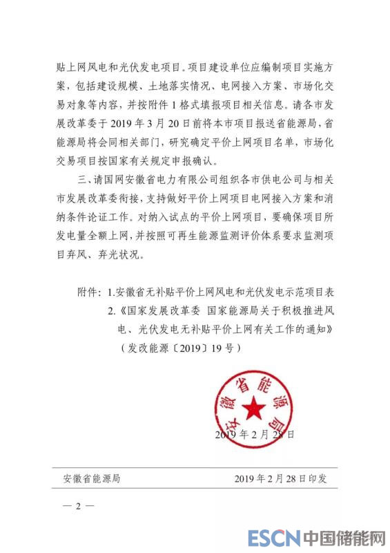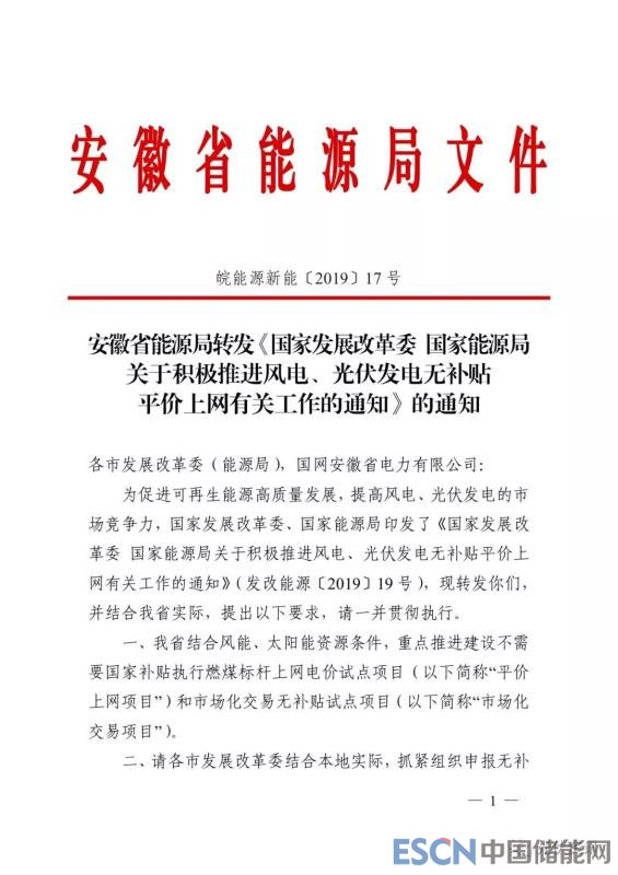 中國儲能網(wǎng)訊:安徽能源局印發(fā)皖能源新能〔2019〕17號 《安徽省能源局轉(zhuǎn)發(fā)《國家發(fā)展改革委 國家能源局關(guān)于積極推進風(fēng)電、光伏發(fā)電無補貼平價上網(wǎng)有關(guān)工作的通知》的通知》,要求各市發(fā)展改革委于 2019 年 3 月 20 日前將本市平價上網(wǎng)項目報送省能源局,省能源局將會同相關(guān)部門,研究確定平價上網(wǎng)項目名單,市場化交易項目按國家有關(guān)規(guī)定申報確認。