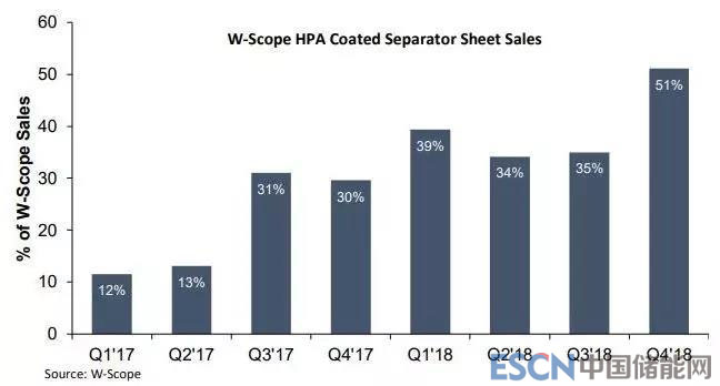 W-Scope在2018年第四季度報告中顯示,作為總銷售額的比例,HPA涂層隔板的銷售比例躍升至51%,而前四個季度的平均銷售量約為34%。W-Scope兩年前宣布,而對于2020年,W-Scope預(yù)測預(yù)期銷售收入將進(jìn)一步增加,比2019年的高出50%,主要是因為另外四條HPA涂層隔膜生產(chǎn)線的資本支出,以應(yīng)對相關(guān)的涂層隔膜供應(yīng)合同與電動汽車行業(yè)。