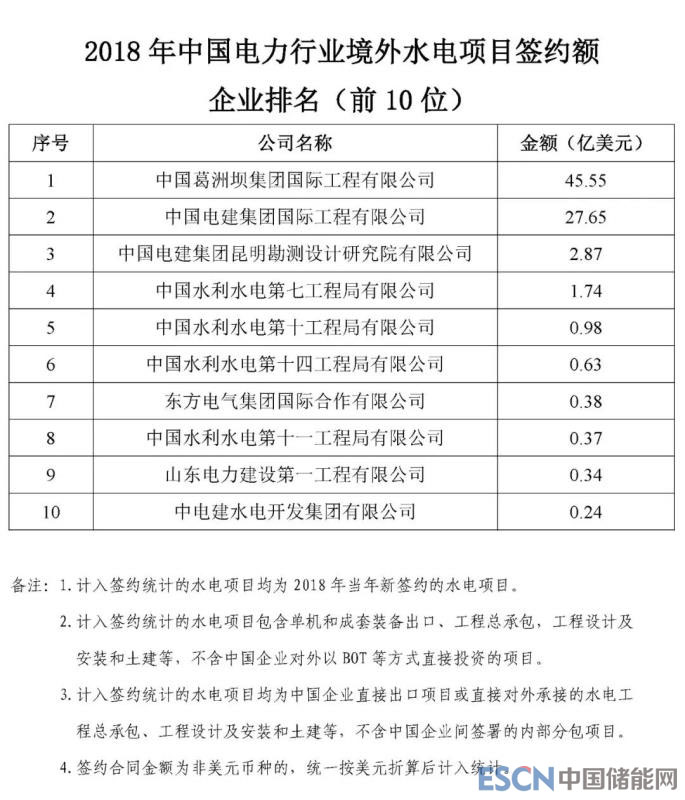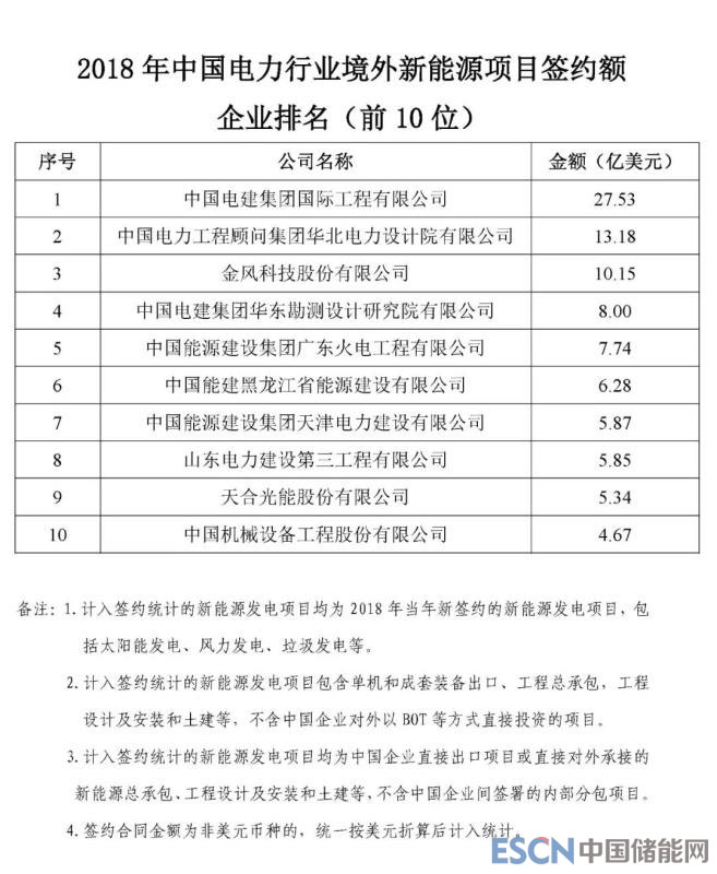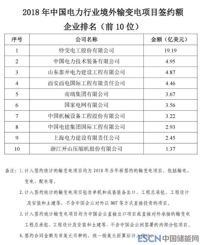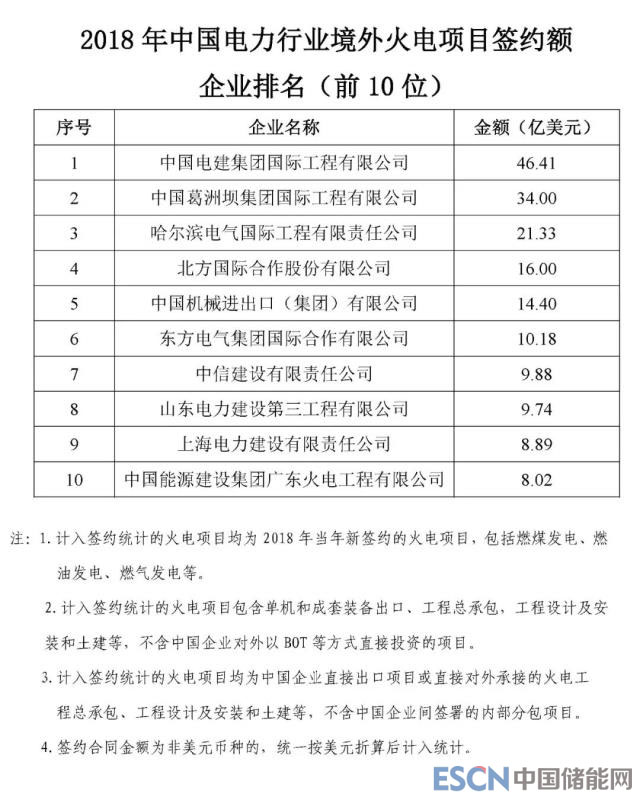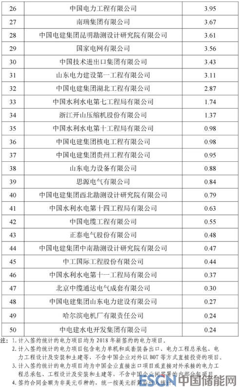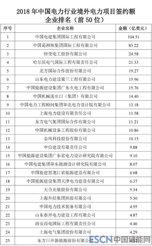 根據(jù)機(jī)電商會統(tǒng)計(jì),2018年,中國電力行業(yè)企業(yè)參與境外電力項(xiàng)目投(議)標(biāo)并最終實(shí)現(xiàn)簽約的項(xiàng)目399個(gè),簽約合同總金額466.8億美元,同比增長5.8%,簽約發(fā)電裝機(jī)總?cè)萘?013.7萬千瓦。根據(jù)各重點(diǎn)企業(yè)報(bào)送的2018年境外電力項(xiàng)目的新簽約情況,機(jī)電商會對企業(yè)簽約額進(jìn)行了排名?,F(xiàn)將排名前50位的企業(yè)名單及各子行業(yè)簽約額排名前10位的企業(yè)名單予以發(fā)布。
