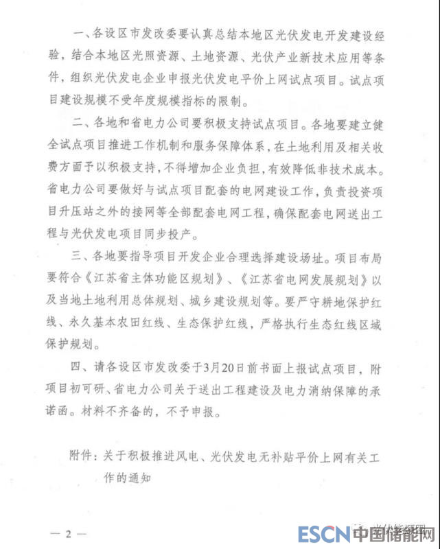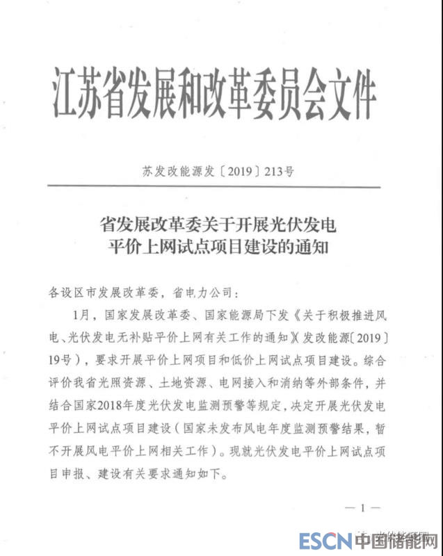 中國儲(chǔ)能網(wǎng)訊:近日,江蘇省相繼發(fā)文啟動(dòng)光伏電站平價(jià)上網(wǎng)項(xiàng)目申報(bào)工作,申報(bào)時(shí)間截止到3月20日。