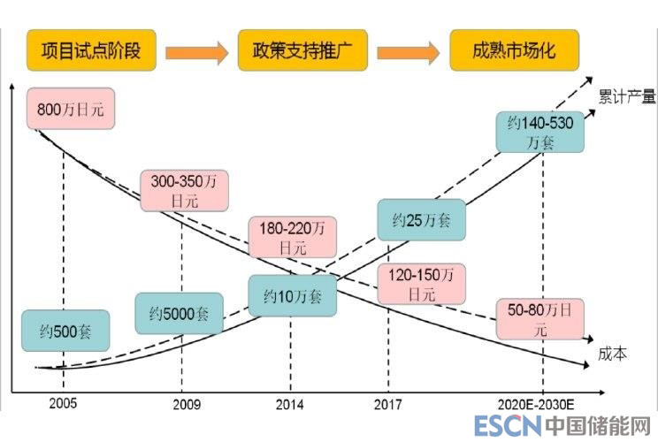 從上圖可知,隨著推廣規(guī)模的擴(kuò)大,以及幾大廠家的競爭加強,整個系統(tǒng)的成本在快速下降,從最初的800萬日元降至了目前的100萬日元左右,也就是6-7萬元人民幣/套。