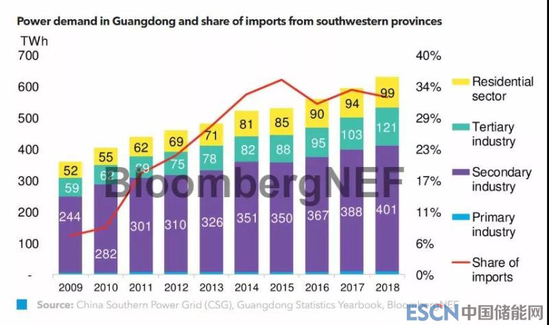 來自云南的水電、貴州的水電和煤電源源不斷地輸入廣東。這部分電量占據(jù)大約全省耗電量的三分之一,解釋了為何全社會(huì)用電量大于本地發(fā)電量的差值。西電東送在廣東的調(diào)度中具有優(yōu)先權(quán)。
