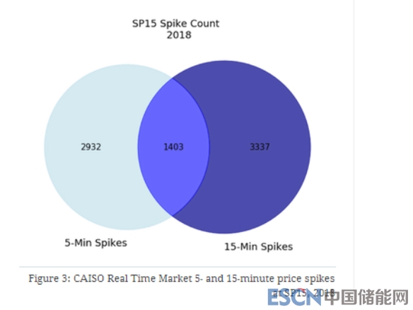 圖3加州獨(dú)立系統(tǒng)運(yùn)營(yíng)商(CAISO)實(shí)時(shí)市場(chǎng)SP15,2018的5分鐘和15分鐘價(jià)格峰值