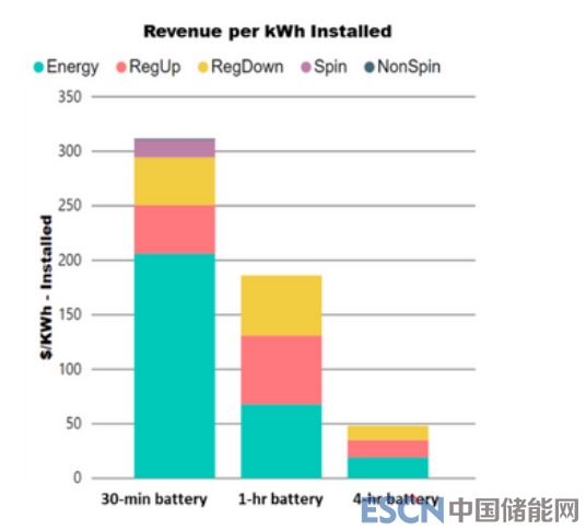 圖4為加利福尼亞州市場(chǎng)的客戶(hù)進(jìn)行的分析提供了見(jiàn)解。在這種情況下,較短持續(xù)時(shí)間的電池可以最大限度地提高每個(gè)單位容量的調(diào)節(jié)和能源市場(chǎng)的收入(包括極低的充電價(jià)格和極高的放電價(jià)格)。