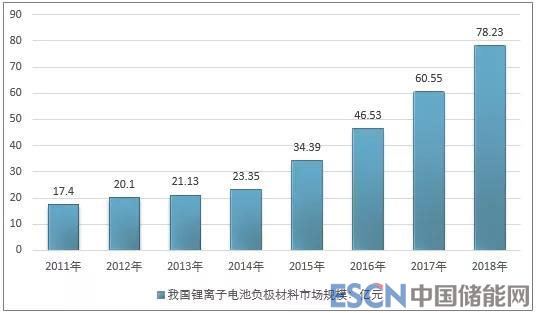2011-2018年我國鋰電負(fù)極材料市場規(guī)模走勢