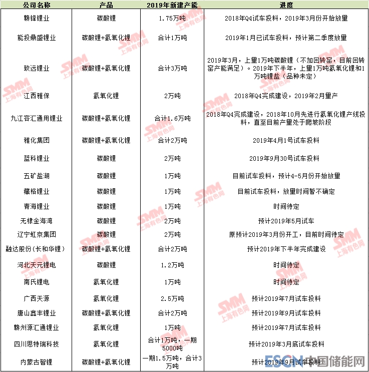 中國儲能網(wǎng)訊:2018年鋰鹽價(jià)格一路下行,與上游供應(yīng)釋放過快,下游需求增速不及釋放增速密切相關(guān)。據(jù)SMM統(tǒng)計(jì),2018年中國碳酸鋰產(chǎn)量為11.65萬噸,氫氧化鋰產(chǎn)量為5.02萬噸。而2019年上游新建產(chǎn)能數(shù)量以及進(jìn)度情況,也自然成為業(yè)界關(guān)注的焦點(diǎn),對此我們總結(jié)如下: