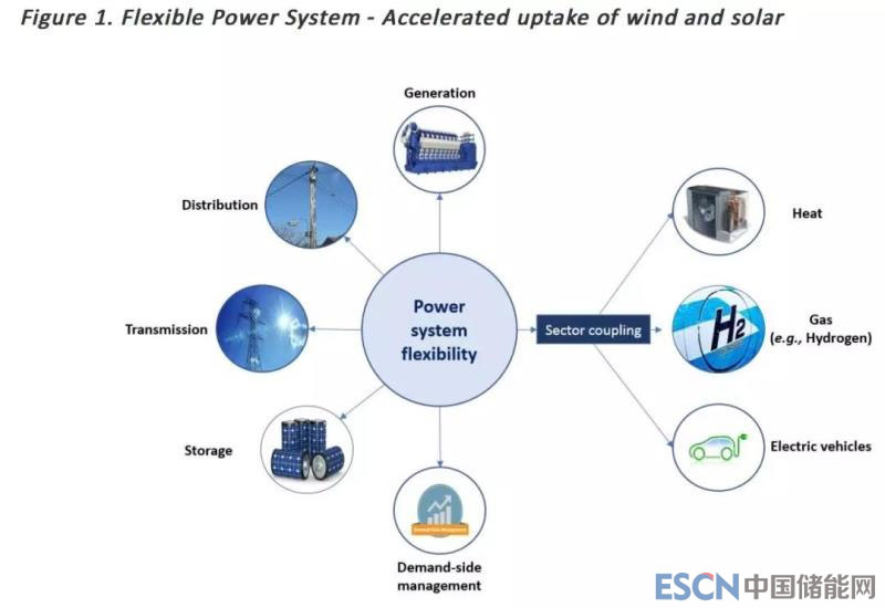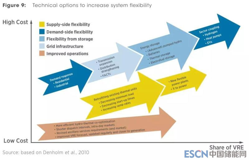 這么大比例的間歇性可再生能源要求電網(wǎng)具有更大的靈活性。根據(jù)IRENA的引用專家的觀點(diǎn),電網(wǎng)實(shí)現(xiàn)更大的靈活性有五種途徑,按照成本(從低到高)排列如下: