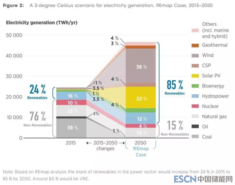 中國(guó)儲(chǔ)能網(wǎng)訊:按照國(guó)際可再生能源署(IRENA)最近發(fā)表的一份報(bào)告中,如果全球溫升控制在2攝氏度以內(nèi),要求2050年全球電力供應(yīng)的85%來自可再生能源,其中間歇性電源占58%(風(fēng)電36%、光伏22%),其余11%為化石能源、4%為核電。