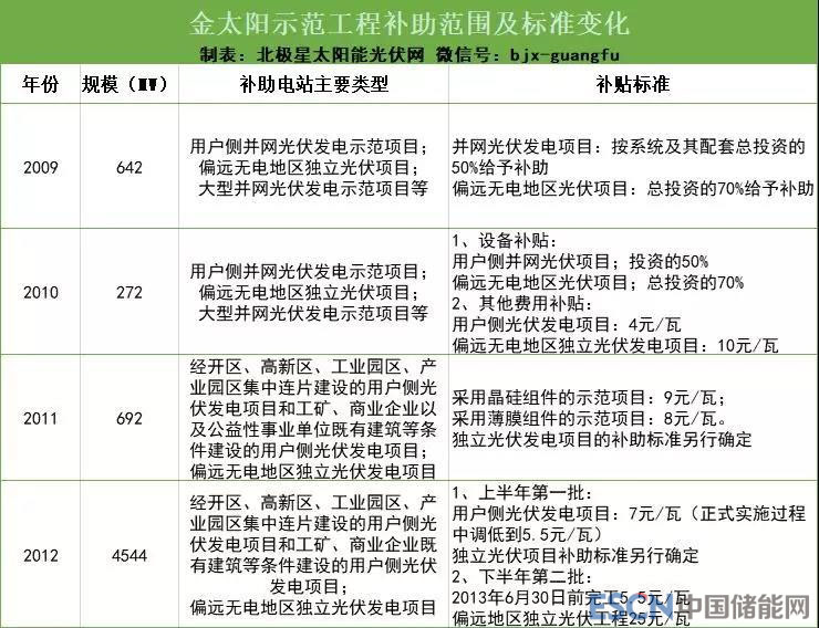 金太陽(yáng)工程:2009年7月,財(cái)政部、科技部、國(guó)家能源局聯(lián)合發(fā)布《關(guān)于實(shí)施金太陽(yáng)示范工程的通知》,計(jì)劃在2~3年內(nèi),采取財(cái)政補(bǔ)助方式支持不低于500MW的光伏發(fā)電示范項(xiàng)目。而具體的補(bǔ)助范圍和金額也在接下來(lái)的2009~2012年進(jìn)行了逐年調(diào)整,見下表:
