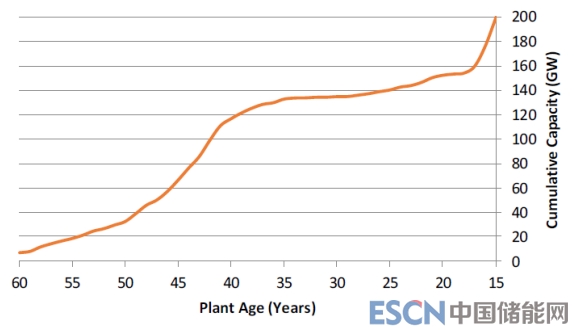 圖1按發(fā)電廠年限(年)計算的累積峰值容量(GW)