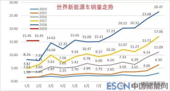 近年世界新能源車(chē)走勢(shì)較強(qiáng),逐月上升態(tài)勢(shì)明顯。2019年2月數(shù)據(jù)還沒(méi)出來(lái)世界匯總的,我用1月數(shù)據(jù)暫代,主要體現(xiàn)1月的數(shù)據(jù)在圖中更清晰。