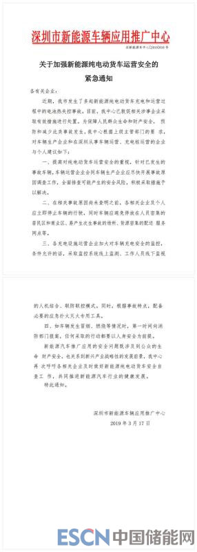 3月17日,深圳市新能源車(chē)輛應(yīng)用推廣中心發(fā)布一則《關(guān)于加強(qiáng)新能源純電動(dòng)貨車(chē)運(yùn)營(yíng)安全的緊急通知》(以下簡(jiǎn)稱(chēng)“通知”),“通知”表示,近期深圳市發(fā)生了多起新能源純電動(dòng)貨車(chē)充電和運(yùn)營(yíng)過(guò)程中的電池?zé)崾Э厥鹿?,為保障人民群眾生命和?cái)產(chǎn)安全,預(yù)防和減少此類(lèi)事故發(fā)生,深圳市新能源車(chē)輛應(yīng)用推廣中心對(duì)車(chē)輛生產(chǎn)企業(yè)和在深圳從事車(chē)輛運(yùn)營(yíng)、充電樁運(yùn)營(yíng)的企業(yè)提出以下建議: