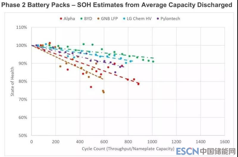 根據(jù)ITP Renewables公布測試結(jié)果,比亞迪Battery-Box電池組(綠色虛線)的容量衰減程度在測試組中排名最低