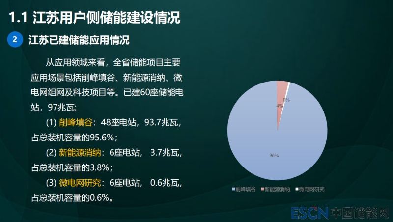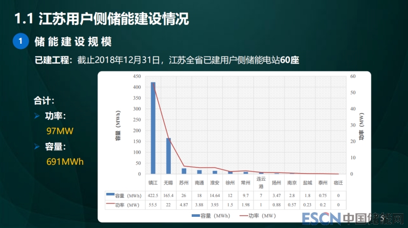 首先講一下江蘇用戶側(cè)儲(chǔ)能情況,我之前說過承擔(dān)了兩個(gè)國網(wǎng)公司的項(xiàng)目,去年息我一個(gè)項(xiàng)目結(jié)束了,就是做用戶側(cè)儲(chǔ)能的控制,主要是讓用戶側(cè)儲(chǔ)能對(duì)大電網(wǎng)形成有效支撐,當(dāng)時(shí)主要做調(diào)峰,在局部地區(qū)做了調(diào)頻的實(shí)驗(yàn)嘗試,都是一些示范項(xiàng)目。全省到了97兆瓦的功率,容量是691兆瓦時(shí),不包含江蘇的電網(wǎng)側(cè)儲(chǔ)能,我們還有很大量,不含在這個(gè)里面,我們的用戶側(cè)是這樣的。